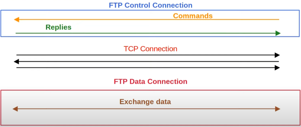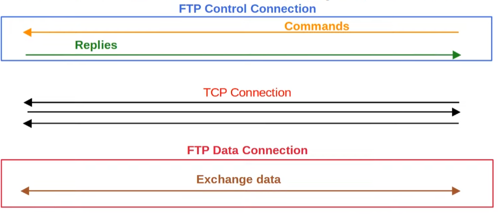 - Control: It the first established connection with the port TCP 21 and is used only to send and receive commands.