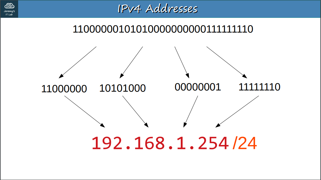 The “/” after the IP Address, for example: 192.168.0.1/24, says that from left to right: 24 bits represent the Network portion and 8 bits (the rest) represent the Host portion. The Network portion can count how many networks can be created and the Host portion how many clients can have their own IP Address