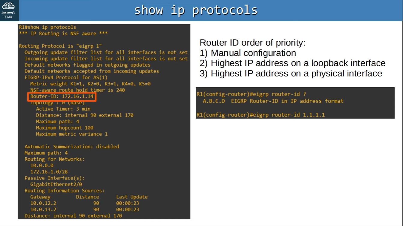 network 192.168.2.0 0.0.0.255Each router in a EIGRP Autonomous System will have a unique Router ID which can be defined as followed: