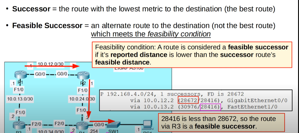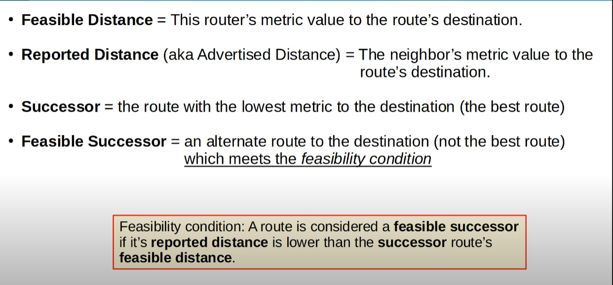 - Feasible Sucessor: It a alternate route to the destination (not the best route). It must meet the feasibility condition: its reported distance must be lower than the successor’s feasible distance