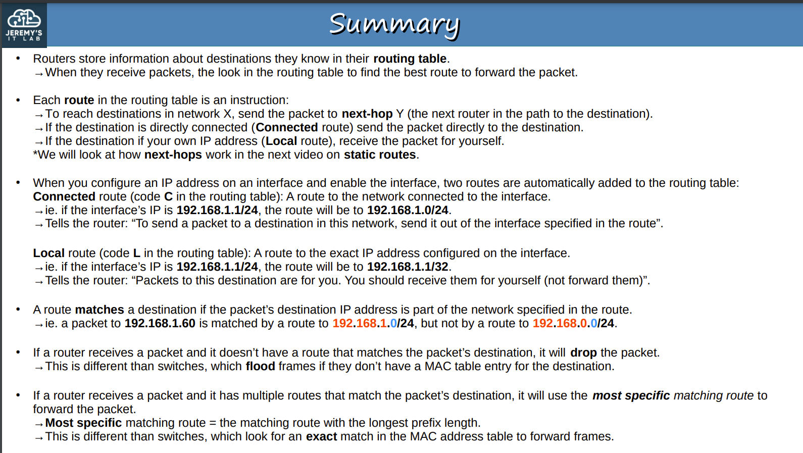 - If the router receives a packet with a destination IP Address to networking with no matching route, it will drop the packet.
