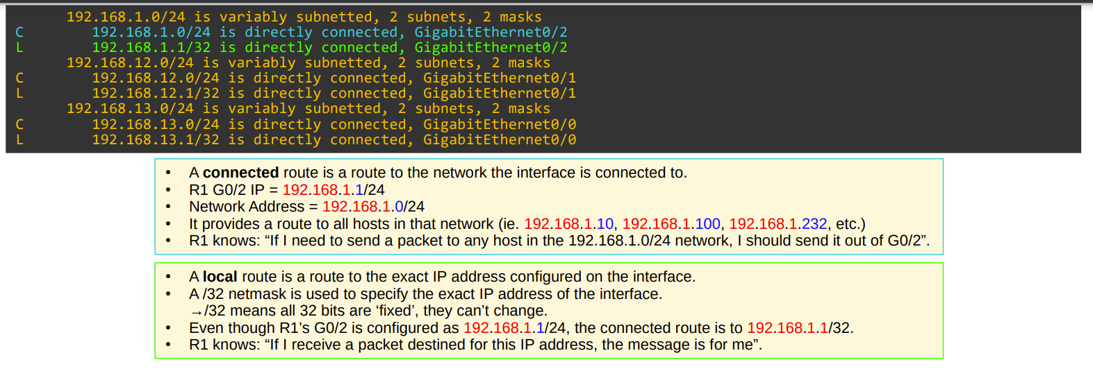After assigning an IP Address and enabling an interface, 2 types of routes are added: