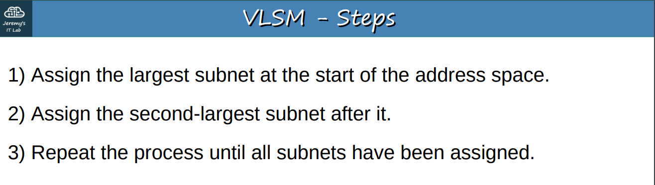 - Assign the first subnet to the largest one starting from the address space